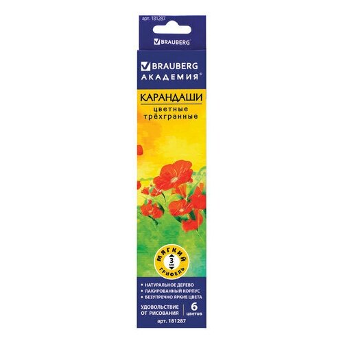 Карандаши цветные BRAUBERG Цветы, набор 6 цветов, трехгранные, лакированное дерево, 181287, 12 шт.)