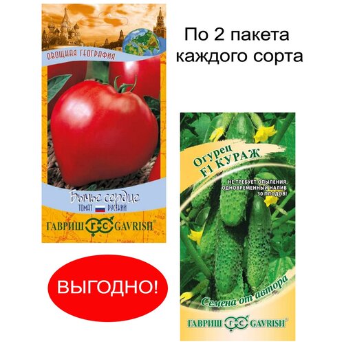 Два очень популярных сорта. По 2 пакета каждого сорта всего 4 пакетика).Томат Бычье сердце 0,1г.Популярный урожайный сорт. Позднеспелый. От всходов до плодоношения 120130 дней. Растение среднерослое, малооблиственное. Высота главного стебля до 150 см. Рекомендован для открытого грунта и пленочных теплиц. Выращивают рассадным способом. Плоды очень крупные, сердцевидной формы малосеменные, мясистые, красные, при первом сборе достигают массы 400 г, при последующих до 200 г. Сорт высоко ценится за крупноплодность и великолепный вкус. Томат преимущественно салатного назначения. Также пригоден для консервирования томатов кусочками, 4 г, 15,0 см, 8,0 см, 3 мм, 72 месяца.Огурец F1 Кураж, 10 семян в пакете.Новый скороспелый партенокарпический гибрид от всходов до плодоношения 4550 дней), женского типа цветения, предназначен для выращивания в пленочных теплицах. Растения сильнорослые, побегообразовательная способность средняя. В узлах образуется по 24 завязи до 56 штук). Зеленец темнозеленый со светлыми полосами, длиной 1215 см, массой 120130 г, бугорчатый, белошипый, универсального использования. Вкусовые качества высокие, без горечи. Плотность посадки 2,53,0 растм2. Относительно устойчив к основным заболеваниям огурца. Урожайность 68 кграст.