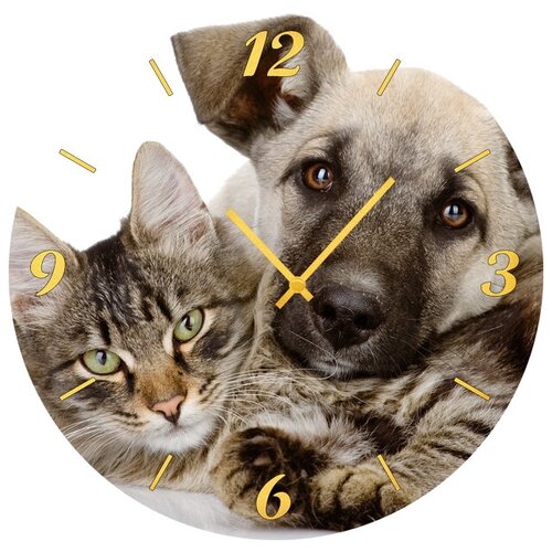 Настенные часы. Модель для современного интерьера. Механизм: Кварцевый Корпус: Дерево Размер: Диаметр 40 см Коллекция: Pets Рисунок: Пес и кот