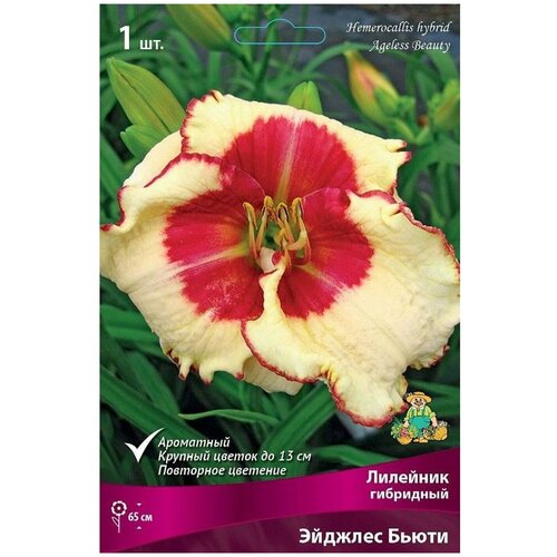 Лилейник гибридный Эйджлес Бьюти корневищное многолетнее растение, чаще используется для ландшафтного дизайна. Лилейник один из самых неприхотливых многолетников, он зимостоек и засухоустойчив, прекрасно растт на хорошо освещенных участках. Куст высотой до 65 см. На одном растении распускается до 10 бутонов. Цветки крупные, кремовожелтые с красной окантовкой и глазком, горло зеленое, гофрированный. С повторным периодом цветения: июльавгуст. Цветки сохраняют свою декоративность с весны до глубокой осени. На зиму растение можно не обрезать, достаточно мульчировать кусты торфом или травой. На одном месте может расти очень долго, образуя крупные, широкие кусты.