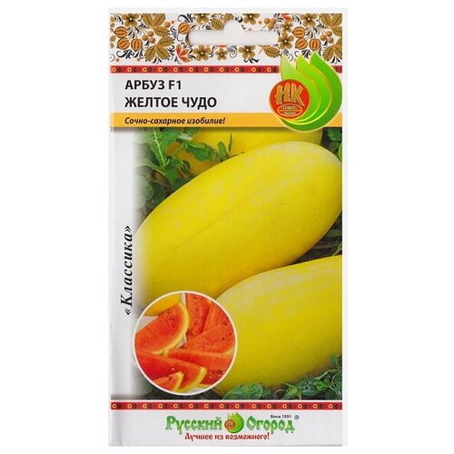 Семена Арбуз Желтое чудо F1 Раннеспелые 5 шт.уп. Арбузная ягода, особенно в Подмосковном огороде, уже чудо. А если арбуз еще и с жлтой корой, то это Жлтое чудо. Раннеспелый гибрид принесет плоды уже через 7075 дней после посева. Короткоовальные, с красивой и прочной яркожлтой корой без полос. Издали арбуз вполне можно принять за дыню. Средняя масса до 3,5 кг. Мякоть насыщеннокрасная, очень сочная и сладкая. Содержание сахаров до 11. Замечательный свежий и сладкий десерт для всей семьи. Семена небольшие. Растения сильнорослые.