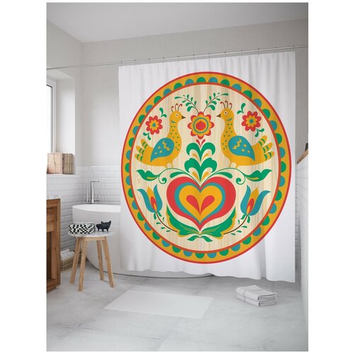 Штора занавеска) для ванной JoyArty Тарелка с птицами из сатена, 180х200 см с крючками