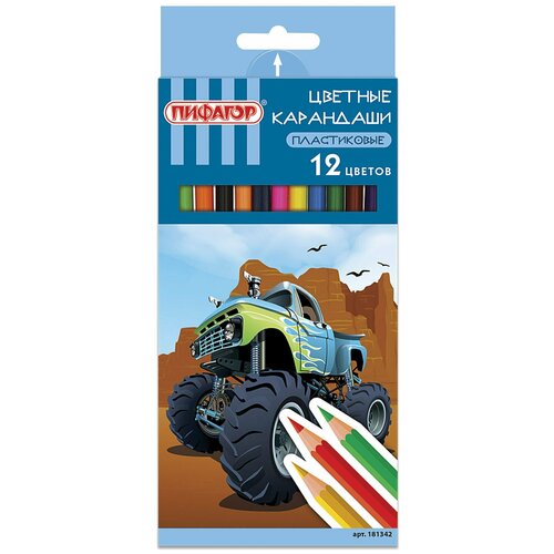 Карандаши цветные пифагор джип, 12 цветов, пластиковые, классические заточенные, 181342 2 шт.