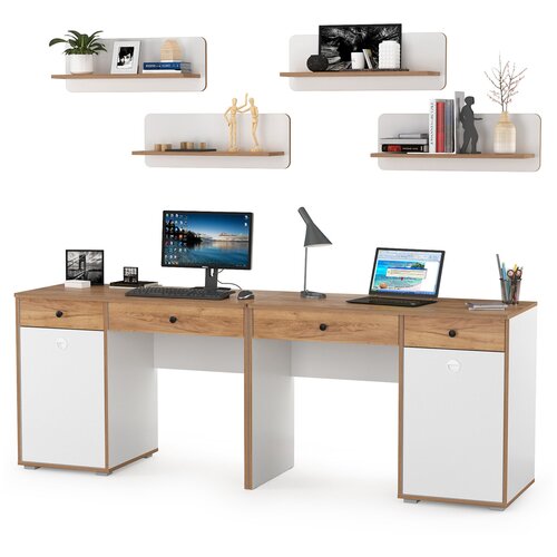 Столы письменные и четыре открытых полки для двоих детей Вуди, цвет белый премиумдуб крафт золотой, ШхГхВ 220х52,7х180 см., универсальная сборка