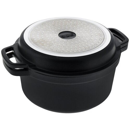 Кастрюля с крышкойсковородойгриль Maestro MR 4124 имеет диаметр 24 сантиметра, полезный объем кастрюли составляет 3,3 литра, корпус кастрюли и крышкисковородыгриль изготовлен из прочного литого алюминия, с многослойным дном, подходящим для всех типов источников тепла. Внутренняя поверхность покрыта антипригарным покрытием, позволяющее варить, тушить и даже жарить продукты в кастрюле. Крышка является полноценной сковородойгриль, которую можно использовать как обычную крышку для кастрюли, так и как самостоятельную сковороду с индукционным дном.