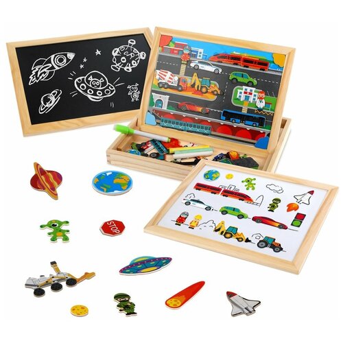 Эксклюзивная разработка ТМ Mapacha! В этом чемоданчике 12 обучающих и веселых игр с магнитами. Используя магниты, можно составлять разные сюжеты на заданную тему. Тема этого бизичемоданчика транспорт и профессии, связанные с транспортом. Помимо видов транспорта и представителей профессий в игре есть дополнительные магниты с разными атрибутами, которыми ребенок может заполнять сюжетное пространство. Строгих правил в играх нет, всегда можно отступать от предложенного сюжета, фантазировать и разыгрывать целые спектакли. Благодаря этим играм, родители могут познакомить ребенка с особенностями той или иной профессии, поговорить о правилах дорожного движения и даже поразмышлять об устройстве Вселенной. Малыш может учиться сравнивать предметы по различным признакам, а еще решать простые логические задачки. В набор входит магнитномаркерная доска. При этом обратная сторона доски грифельная, на ней можно рисовать настоящими мелками. В дополнение к магнитам в чемоданчике есть два цветных фона. Фоны это сюжетные декорации к играм. Внутри чемоданчика также есть подробная красочная инструкция, в которой показаны примеры возможных игр. Ну и конечно, родители с ребенком могут придумывать собственные игры с чемоданчиком. Комплектация: доска для рисования фон 2 шт. ящик мелки фломастер инструкция губка магниты 50 шт.