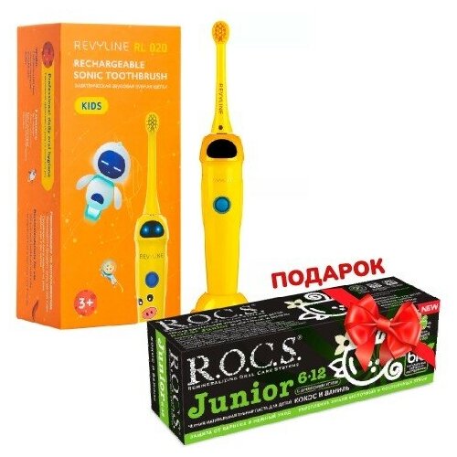 Revyline RL 020 Kids электрическая зщ, желтая подарок ROCS JUNIOR Зубная паста для детей 612 лет BLACK кокос и ваниль, 74 гр)
