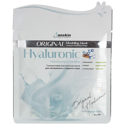 Альгинатная маска с гиалуроновой кислотой Anskin Hyaluronic Modeling Mask устраняет сухость и шелушения, насыщает клетки влагой и поддерживает оптимальный воднолипидный баланс. Маска улучшает способность клеток к удержанию влаги, повышает уровень увлажненности кожи, предупреждает появление обезвоженности и дегидратации. Выравнивает тон, устраняет тусклость и покраснения, возвращает коже ровное сияние. Справка: Что такое альгинатные маскиАльгинатные маски это натуральные маски, созданные на основе альгинатов солей альгиновой кислоты, добываемых из морских водорослей. Альгиновая кислота быстро связывает молекулы воды и образует при этом гелеобразное вещество, богатое протеинами, минеральными веществами, аминокислотами и витаминами. Этот мощный природный коктейль великолепно питает и увлажняет кожу, обеспечивает лифтингэффект, активизирует процессы регенерации клеток, ускоряет синтез коллагена, способствует насыщению кислородом, выводит из клеток соли тяжелых металлов и токсины, сужает поры и уменьшает проявления купероза, устраняет раздражения и шелушения.Главным действующим компонентом маски является низкомолекудярная форма гиалуроновой кислоты гиалуронат натрия. Проникает в глубокие слои эпидермиса, активно увлажняет клетки, способствует удержанию влаги в коже. Образует защитный слой, который не дает влаге испариться.Дополнительные действующие ингредиенты: Экстракт солодки обладает регенерирующим действием, помогает уменьшить признаки раздражения и отечность, успокаивает кожу и стимулирует синтез коллагена. направленной на борьбу с избыточной пигментацией. Экстракт ромашки обладает заживляющим восстанавливающим действием. Успокаивает раздражения, снимает покраснения, препятствует появлению воспалений. Аллантоин интенсивно увлажняет кожу, способствует сужению пор и нормализации выработки кожного сала, обладает противовоспалительными свойствами, успокаивает и смягчает раздраженную кожу. Подходит для всех типов кожи.Способ применения: 1. Смешать в миске порошок и воду в соотношении 1:2 на 25 гр порошка 50 мл воды);2. Быстрыми движениями перемешайте до однородной массы при помощи шпателя.3. При помощи шпателя нанесите маску слоем 35 мм на очищенную кожу лица, оставляя открытыми только ноздри.4. Оставить маску на 2025 минут до застывания. Удалить е одним пластом, от подбородка ко лбу. Рекомендации: За 23 минуты до наложения маски рекомендуется наносить биоактивные сыворотки, кремы или гели. Альгинатные маски при застывания уменьшаются в объеме, за счет чего оказывают на кожу небольшое давление. Этот свойство позволяет усилить проникновение сыворотки или другого средства, нанеснного под маску. Внимание! Внешний вид товара может отличаться от фотографий на сайте. Несовпадение внешнего вида и комплектности реального товара с фотографиями и