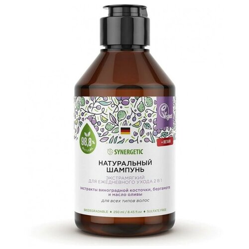 Synergetic натуральный бессульфатный шампунь Экстрамягкий для ежедневного ухода 2 в 1, 250 мл