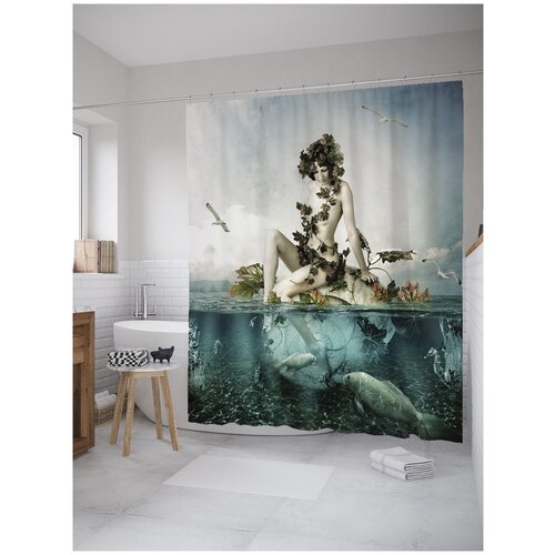 Штора для ванной, занавеска в ванную комнату JoyArty Превращение русалки из сатена, 180х200 см с крючками