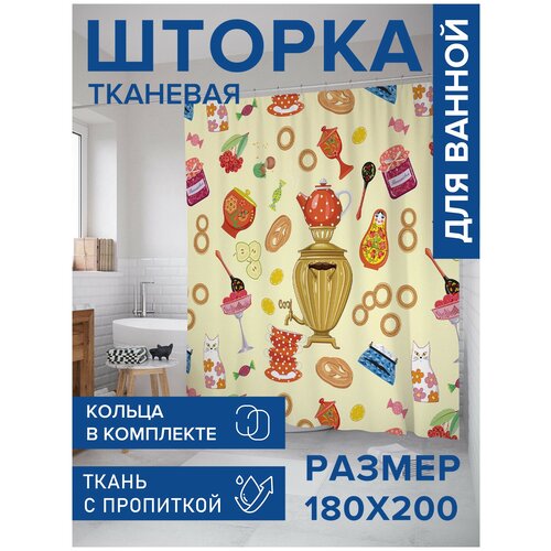 Штора для ванной, занавеска в ванную комнату JoyArty Самовар и сладости из сатена, 180х200 см с крючками