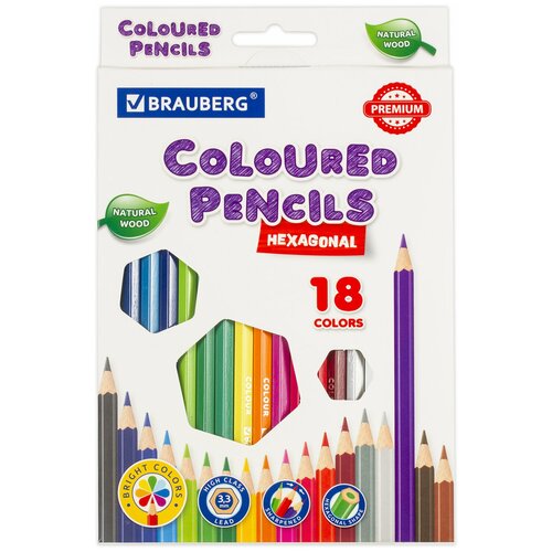 Карандаши цветные BRAUBERG PREMIUM, 18 цветов, шестигранные, грифель мягкий 3,3 мм, 181657