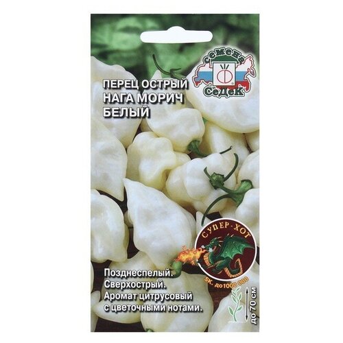 Артикул: 1897691. Вес: 3 гр., Агрономический срок годности, лет: 3, Размер упаковки: 8 x 0.1 x 15 см., Температурное ограничение: Нет, Сроки созревания: Поздний, Вкус: Острый, Цвет: Белый, Особенности выращивания: Открытый грунт, Сорт или гибрид: Гибрид F1, Посев на рассаду: Февраль Март. Позднеспелый 130140 дней) сорт сверх острого перца для выращивания в теплице, относится к виду c. Chinense, родиной которого является северовосточная Индия и Бангладеш. Растение высотой до 70 см, компактное, не требует формирования. В каждом узле образует 37 завязей. Плоды массой до 10 г, от молочного до цвета слоновой кости окраски. Аромат мякоти цитрусовый с цветочными нотами. Максимальная острота достигает 1 000 000 сковиллов. Жгучесть перцу придает капсаицин, который применяется в медицине в качестве обезболивающего и разогревающего средства. Благотворно действует на кровообращение и сердечную мышцу, спасает от переохлаждения и вызывает выработку эндорфинов, уничтожает раковые клетки, снимает депрессию. Может выращиваться в домашних условиях. Оптимальный объем горшка 57 литров. Срок жизни одного растения не меньше пяти лет. В зимнее время для продолжения вегетации и плодоношения потребуется досветка. Плоды рекомендуется с осторожностью употреблять в пищу в свежем виде незрелыми зелеными) пока они еще не налились огнем. Используется в любом кулинарном виде: маринованными, в соусах, маслах, овощных, рисовых и мясных смесях. Предупреждение: если вы чувствуете сильную жгучесть во рту, и это доставляет вам неудобство, не запивайте водой, она придаст ещ больше остроты. Лучше употреблять этот перец с молоком или сливками или заедать сметаной или мороженым. .