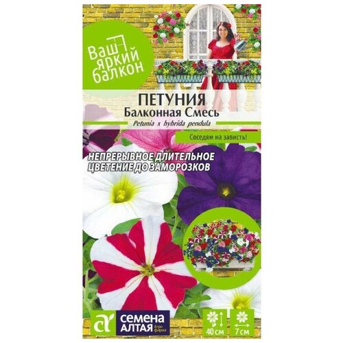 Семена петунии 34;Балконная смесь34;. Петуния самое распространенное декоративное садовое растение, обильноцветущее и, сравнительно, неприхотливое. Ниспадающие побеги петунии Балконной, достигающие в длину 40 см, усыпаны крупными до 7 см диаметром) цветками различных окрасок и цветовых сочетаний. Растение отличает стабильный рост в различных условиях выращивания. Используется для декоративного оформления балконов, фасадов зданий, городских и садовых участков, для украшения террас, веранд и арок. Светолюбивое и достаточно засухоустойчивое растение. Предпочитает легкие плодородные, хорошо дренированные почвы. Посевы на рассаду проводят с середины февраля. Семена равномерно распределяют по поверхности субстрата, не заделывая, а лишь слегка вдавливая в грунт. Посевы увлажняют из распылителя и накрывают стеклом для поддержания постоянной влажности. Емкость помещают в светлое теплое место 43;2224С). Всходы появляются через 1015 дней, стекло убирают. Февральским посевам требуется дополнительная подсветка. Пока всходы мелкие, их лучше не поливать, а опрыскивать, избегайте попадания на них прямых солнечных лучей. Пикировку проводят в фазе 12х настоящих листочков. В открытый грунт рассаду высаживают в конце мая начале июня, когда минует угроза возвратных заморозков. Посадочный интервал 3040 см. Обильное и продолжительное цветение с июня до осенних заморозков. Возможно сохранение растений зимой в освещенном помещении при температуре около 43;12С с предварительной обрезкой побегов.