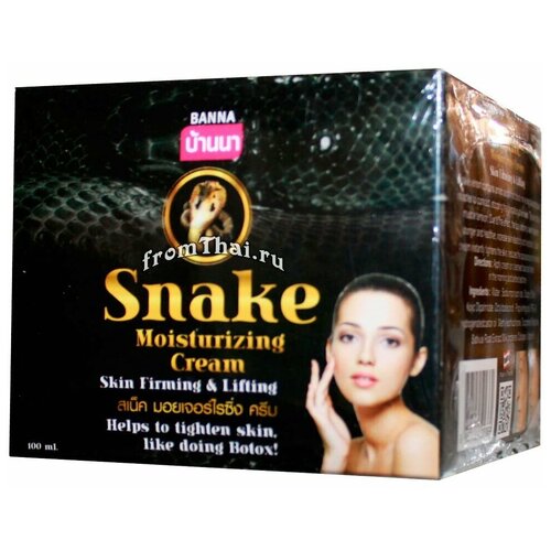 Артикул: 1615239. Вес: 186 гр., Размер упаковки: 9.5 x 8 x 9.5 см., Температурное ограничение: Нет, Область применения: Для лица, Вес, гОбъм, мл: 100, Вид: Крем, Тип кожи: Зрелая, Возраст: От 35 лет, Применение: Дневной. Популярный, тайский крем Banna с содержанием змеиного яда, который сокращает мышечную активность мимической мускулатуры, что приводит к результату, схожему с эффектом ботокса. Уже после нескольких дней применения данного средства из Таиланда можно увидеть заметный результат: крем разглаживает морщины, расслабляет мышцы лица и устраняет характерные заломыморщинки в уголках глаз, на переносице, на лбу. Крем с ядом змеи обладает увлажняющим и регенерирующим действиями, повышает упругость и тонус кожи, уменьшает имеющиеся морщинки и полностью устраняет появление новых морщин.Способ применения: нанесите крем на чистую сухую кожу лица, шеи и область декольте. Нежно помассируйте кончиками пальцев до полного впитывания.Состав: вода, змеиный яд, Sodiumpolyacrylate, Dicapryl Ether, Kojic Dipalmitate, Octyldodecanol, Propylenegiycol, PEG40 гидрогенизированное эфирное масло Methylisothiazlinone, Tocopherol, экстракт корня Raphanus Sativus, молочные белки, коллаген, витамин E.Противопоказания: только для наружного применения. Избегайте контакта с глазами, слизистыми оболочками.