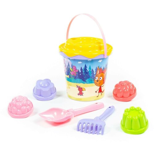Набор для песка Три кота 5: Ведро с наклейкой, ситечко Солнышко, лопатка 5, грабельки 5, 4 формоч