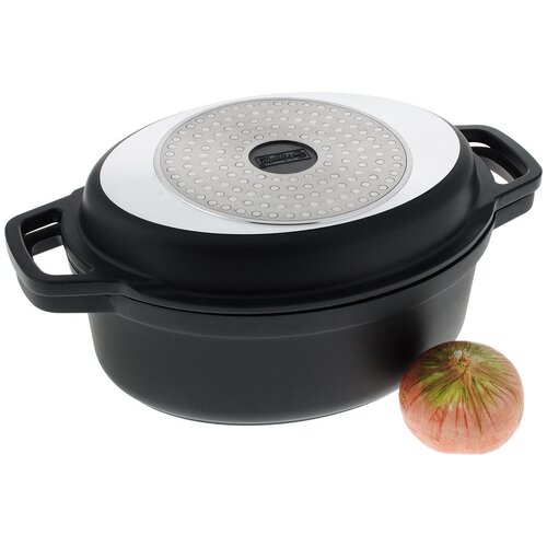 Кастрюля Maestro Cast с крышкойгриль MR4126 изготовлены из прочного литого алюминия. Металл экологически чистый, наджный, не поддатся деформации при воздействии высоких температур, не выделяет опасных для Вашего здоровья примесей и не влияет на цвет и вкусовые качества продуктов. Имеет внутреннее антипригарное покрытие и внешнее термостойкое. Крышка выполняет две задачи: сковородыгриль с индукционным дном и самой крышки для кастрюли. Она утолщена, а е внутренняя сторона рифлная. Поэтому во время приготовления излишки масла стекают в специальные желобки, а Ваши закуски приобретают аппетитные и поджаристые полосочки.