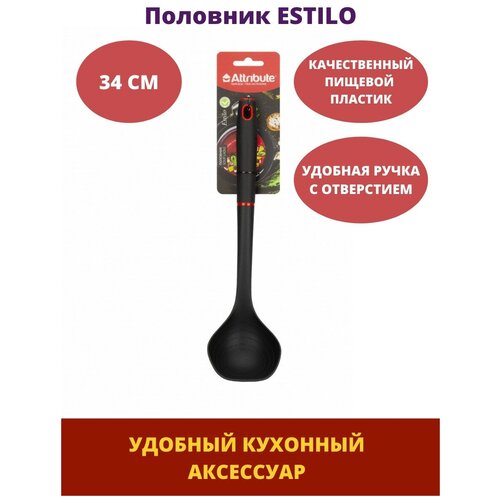 Половник ESTILO это кухонный аксессуар из линейки ATTRIBUTE GADGET. Устройство выполнено из качественного пластика, а также оснащено пластиковой ручкой черного цвета. Половник для приготовления блюд незаменимый атрибут для кухни. Вы можете подобрать к нему в комплект другие устройства из линейки ESTILO. Длина устройства 34 см.Половник пластиковый позволяет легко наливать порции супа, каш, пюре в тарелки. Кулинарный половник не впитывает запах, легко моется, в том числе и в посудомоечной машине.Половник из термостойкого пластика подходит для разливания жидких блюд.Половник займет достойное место среди других ваших кухонных помощников.
