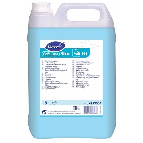 Мыло жидкое Diversey Soft Care Star свежесть 5 л. Назначение. Soft Care Star это наливное мыло для рук общего назначения. Сочетание моющих и увлажняющих компонентов эффективно удаляет загрязнения с кожи рук, не пересушивая ее. Освежающая отдушка оставляет приятный аромат на коже рук. Мыло Soft Care Star можно использовать с любым диспенсером для наливного мыла за исключением диспенсеров из алюминия). Способ применения. Нанести 12 порции средства на влажную кожу рук. Тщательно помыть руки, уделяя особое внимание зонам между пальцами. Ногти помыть щеточкой для ногтей. Ополоснуть руки теплой водой и высушить бумажным полотенцем. При необходимости нанести кожный антисептик. Меры предосторожности. Хранить в заводской упаковке. Не подвергать воздействию перепадов температуры. Состав. Вода, лауретсульфат натрия, хлорид натрия, кокамид ДЭА, глицерин, дистеарат гликоля, лимонная кислота, лаурет4, отдушка, кокамидопропил бетаин, DMDM гидантоин, CI 42051 Условия хранения. Хранить в закрытой заводской упаковке в темном месте вдали от высоких температур минимально 5Cмаксимально 40C). Срок годности. 2.5 года.
