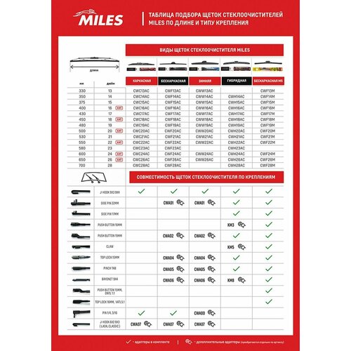 Щетка стеклоочистителя гибридная 430 мм 4 адаптера) CWH17AC MILES . Компания MILES динамично развивающийся бренд автомобильных запасных частей, известный с 2000 года. В настоящее время MILES предлагает широкий выбор изделий для ремонта и технического обслуживания автомобилей европейского, азиатского и российского производства. Бренд Miles начал свой путь в 2000 году в Бельгии. Создатель бренда всемирно известная группа Autodistribution International, которая является ведущей торговой организацией в области автоиндустрии.