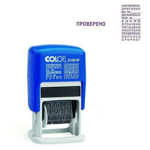 Штамп стандартный Colop S120W позволяет получить оттиск с одним из 12 бухгалтерских терминов: Аннулировано, Оригинал, Вх. , Депонировано, Исх. , Копия, Оплачено, Погашено, Получено, Проверено, Образец, Срочно!. Выполнен в современном дизайне. Компактный надежный пластиковый корпус с автоматически окрашивающим механизмом. Оттиск однострочный, размер 243,8 мм. Нужный термин устанавливается вручную при помощи колесика. Комплектация: штамп, синяя сменная штемпельная подушка E10.