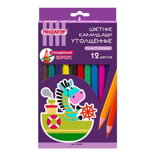 Карандаши цветные 12 цветов Пифагор Зебра L177мм d5мм утолщенные пластик 6 уп 181698