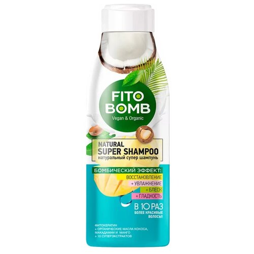 Натуральный шампунь Fito Bomb, восстановление 43; увлажнение 43; блеск 43; гладкость, 250 млНатуральный шампунь с маслами кокоса, манго, фитокератином и шестью ценнейшими экстрактами оказывает суперэффект: великолепно увлажняет и запускает восстановление волос с первого применения, питает от корней до кончиков, придает волосам эластичность, блеск и гладкость. Способ применения: хорошо намочите волосы от корней до кончиков. Нанесите шампунь, аккуратно массируя кожу головы. Тщательно промойте волосы. Состав: Aqua, Sodium CocoSulfate, Cocamidopropyl Betaine, Hydrolyzed Vegetable Protein, Mangifera Indica Seed Oil, Mentha Piperita Leaf Extract, Salvia Officinalis Extract, Hydrolyzed Keratin, Panax Ginseng Root Extract, Coffea Arabica Seed Extract, Rosa Canina Fruit Extract, Rosa Damascena Flower Extract, Euterpe Oleracea Fruit Extract, Vaccinium VitisIdaea Fruit Extract, Laminaria Digitata Extract, Arnica Montana Flower Extract, Behentrimonium Methosulfate , C1040 Isoalkylamidopropylethyldimonium Ethosulfate, Cetyl Alcohol, Cocos Nucifera Oil, Macadamia Ternifolia Seed Oil, Guar Hydroxypropyltrimonium Chloride, Citric Acid, Parfum, Benzyl Alcohol, Sodium Benzoate, Potassium Sorbate.Вес: 285 г.Фасовка: 1 штТип индивидуальной упаковки: Без упаковкиДлина упаковки: 4Высота упаковки: 18.5Ширина упаковки: 7Объем упаковки: 0.518Объем продукта: 0.5333Объем бокса: 8Материал: См. на упаковкеДля кого: Для женщиныОбъм, мл: 250Темпер. ограничение НЕ ниже : 0Температурное ограничение: НетТип волос: Для всех типовЭффект: Блеск, Гладкость, Увлажнение, ВосстановлениеВид шампуня: Жидкий
