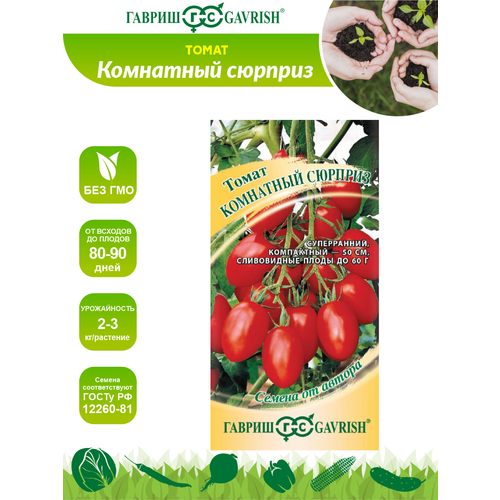Тип продукта: Семена овощных культур. Тип продукта локальный): Семена овощных культур. Тип растения: Однолетнее растение. Род растений: Помидор Сорт Комнатный сюрприз Цвет листвы Зеленый Цвет плодов Красный. Высота растения max см): 20. Долговечность: Однолетнее растение Период посадкипосева в открытый грунт месяц) Май. Место посадки: Полутень солнце. Глубина посева см): Зависит от вида культуры. Расстояние между растениями см): 30x30. Допустимая температура C): От 20 до 30. Частота полива среднее значение): По мере высыхания почвы Частота подкормки среднее значение) 1 раз в месяц Тип удобрения Универсальный Период сбора урожая Июнь, Июль, Август Марка гавриш. Страна производства: Россия. Тип упаковки: Пакетик. Высота товара в индивидуальной упаковке см): 0.4. Глубина товара в индивидуальной упаковке см): 14.4. Ширина товара в индивидуальной упаковке см): 7.9. Вес товара в индивидуальной упаковке кг): 0.004