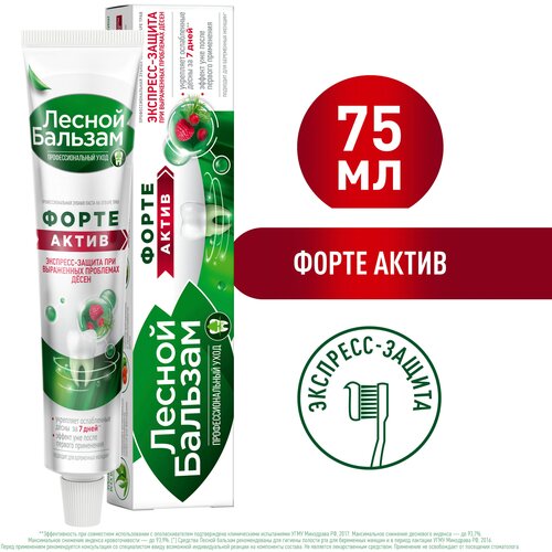 Профилактическая зубная паста Лесной бальзам Форте Актив содержит повышенную концентрацию натуральных экстрактов для усиленного восстановления десен. Зубная паста усилена маслом чайного дерева и уже с первого дня активирует иммунитет полости рта, повышая естественную защиту зубов и десен от вредных бактерий.Клиническидоказанный эффект:1) Эффективна с первого применения.2) В 2 раза снижает воспаление и кровоточивость десенОсобенности состава:1) В состав зубной пасты входит хвойный комплекс с тройной концентрацией отвара трав и 8 фитоэкстрактов. Богатый растительный состав продукта способствует быстрому снижению воспаления и кровоточивости десен, улучшает питание мягких тканей полости рта.2) Паста имеет насыщенный хвойный вкус с богатым вкусом ягод и лечебных трав. Цвет пасты обусловлен высоким содержанием натуральных экстрактов в составе.3) Зубная паста изготовлена на отваре 5 трав ромашка, тысячелистник, крапива, зверобой, чистотел). Отвар трав используется взамен обычной воды и получается в результате низкотемпературной экстракции 35), что позволяет достичь максимально полного переноса ценных веществ из растений в отвар.4) Зубная паста бережно очищает эмаль за счет природного абразива диоксида кремния Silica). Диоксид кремния не царапает эмаль в процессе чистки зубов, при этом позволяет добиться равномерного удаления налета по всей поверхности зубов.5) Зубная паста содержит фтор на уровне 1000 ppm, что соответствует среднему уровню содержания фторидов и подходит для ежедневной защиты эмали от деминерализации.Рекомендации:Зубная паста при кровоточивости десен одобрена Стоматологической Ассоциацией России и рекомендована в качестве профилактического средства при появлении проблем десен гингивит, пародонтит). Использовать минимум 1 раз в день, вечером, для укрепления десен. Свойства подтверждены клиническими испытаниями РФ, 20162017, заявленный результат через 2 недели использования в сравнении с начальным состоянием полости рта. Не является лекарственным средством. Применение не освобождает от посещения стоматолога.