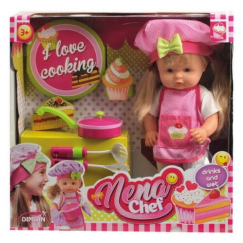 Кукла Нэна-поваренок, 36 см. от итальянского бренда Dimian (Димиан) Без эффектов. В наборе: - кукла, полностью изготовлена из ПВХ, поэтому ее можно купать. - кукла в фартуке и поварском колпаке - бутылочка - сковородка с крышкой - 2 лопатки Описание У куклы подвижные глаза, и конечности; Роскошные прочные волосы. Функции Кукла пьет и писает. Наполните бутылочку водой, и попоите куклу через отверстие во рту, кукла сразу же начнет писать. Дополнительно: Для работы батарейки не требуются. Инструкция не требуется.