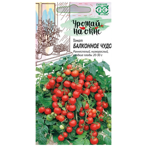Всхожесть: 85.Выращивание вкусных томатов в домашних условиях занятие очень увлекательное. Растения занимают мало места, отлично плодоносят, неприхотливы в уходе, хорошо приживаются в цветочных горшках. Балконное чудо раннеспелый 90 дней от всходов до плодоношения), низкорослый 3040 см), компактный сорт. Он идеально подойдет для выращивания на окне, а также для озеленения балконов и лоджий. Растение не требует подвязки и пасынкования. Плоды округлой формы, массой 2030 г, очень сладкие и сочные, прекрасно подойдут для свежих салатов и консервирования. На рассаду семена высевают в началесередине апреля. Пикировка в фазе первого настоящего листа. Высадка в горшки и балконные ящики в начале мая в возрасте 3035 дней. Растение не только обильно плодоносит, но еще отличается высокой декоративностью и привлекательным видом. Семена после уборки сохраняют всхожесть в течение 10 лет при оптимальных условиях хранения. Рекомендуется увеличить норму высева по окончании срока годности.