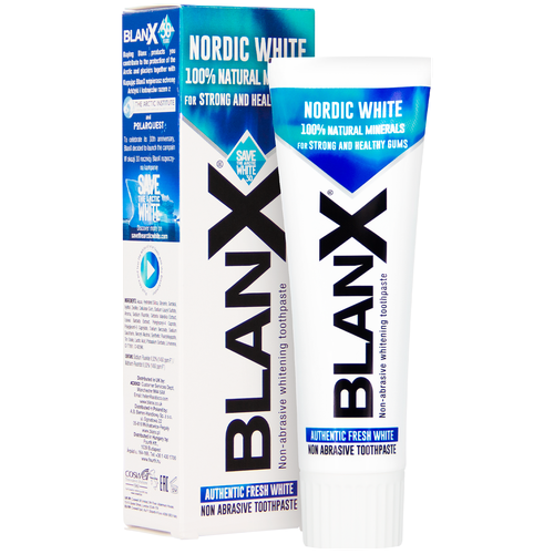 Зубная паста BlanX Nordic White первая неабразивная зубная паста со 100 натуральными минералами вулканического происхождения, в сочетании с арктическими лишайниками для белизны зубов и здоровья дсен. Оказывает успокаивающее и регенерирующее действие Обеспечивает интенсивное отбеливание благодаря комплексному действию арктических лишайников Новый, эксклюзивный вкус с длительным ощущением свежестиУникальные ингредиенты в формуле Nordic White: Природный цеолит это гидратированный алюмосиликат, минерал вулканического происхождения с двойным пористым слоем. Он обладает абсорбирующим, регенерирующим, успокаивающим, очищающим действием. Вулканическая вода это дождевая вода, которая проникает через пористый слой вулканических пород, которые выступают природным фильтром и дают воде уникальные характеристики. Вулканическая вода исключительно чистая, так как вулканические территории всегда защищены от промышленного загрязнения. Экстракт исландского мха Цетрарии ИсландскойЦетрария исландская выделяет Атомарный Кислород, который устраняет застарелые пигментированные отложения на эмали, возвращая зубам здоровый блеск и белизну. Препятствует размножению бактерий, оказывает смягчающее и противовоспалительное действие. Экстракт арктического лишайника Уснеи БородовитойУсниновая кислота, выделяемая арктическим мхом мягко устраняет красящие пигменты на эмали и дентине. Оказывает эффективное антибактериальное действие, защищая от бактерий и кариеса.Зубная паста является безопасной, так как не содержит парабены, SLS, пероксиды, полиэтиленгликоль и диоксид титана.