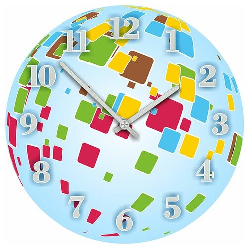 Настенные часы. Модель для современного интерьера. Механизм: Кварцевый Корпус: Дерево Размер: Диаметр 30 см Коллекция: Hi-tech Рисунок: Земной шар и цветные квадраты
