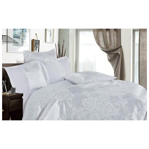 Сатинжаккард относится к тканям премиумкласса. Плотность такого текстиля составляет 140 грамм на 1 кв. см. Основным преимуществом материала является способ переноса изображения на поверхность постельного белья заданный рисунок получают в процессе долгой работы специальных ткацких жаккардовых станков, а не классическим методом окрашивания. Постельное бель из жаккарда это изысканный и ценный подарок себе и близким, полезный и долговечный. Подарочная упаковка. Нижняя часть пододеяльника и простыня сатин гладкокрашеный 100 хлопок. Вверх пододеяльника 100 вискоза. Хлопок делает коллекцию гипоаллергенной, а вискоза покоролевски роскошной и изысканной. Страна Китай. Сертификация EAC Таможенный союз)