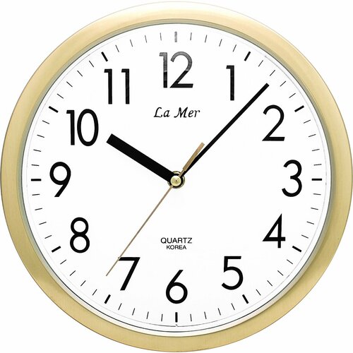 Часы GD205002 арт. Ч7108Тип: настенные часы. Форма: круглая. Особенности: нет. Материал корпуса: пластик. вес брутто: 1 КГ. вес нетто товара: 1 КГ. Цвет корпуса: золотистый. Гарантийный срок: 12 МЕС. Тип питания: от батареек. Типоразмер элемента питания: AA. Вид цифр: арабские. Размер циферблата: 23x23 см. Механизм: кварцевый. Вывод времени: стрелочный. Защита циферблата: стекло. Цвет циферблата: белый. Элементы питания в комплекте: да. Размер, см: 27x27x5. Страна происхождения: Россия. Настенные часы La Mer GD205002 это истинное воплощение стиля. Они будут замечательно смотреться и в строгом офисе, и в уютной домашней обстановке. Корпус выполнен из пластика золотистого цвета. Циферблат с арабскими цифрами защищен прочным стеклом. Кварцевый механизм отличается особой надежностью и долговечностью. Часы имеют плавный ход стрелок, который делает их работу совершенно бесшумной. Размеры часов ВхШхГ): 27х27х5 см. Тип питания: 1 батарейка типа 34;АА34; входит в комплект).