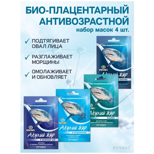 Идеально подобранный биоплацентарный набор из 4 масок для комплексного и всестороннего решения проблем. 34;Акулий ЖИР И ламинария34; Насыщает кожу кислородом, разглаживает морщины, устраняет отеки и стимулирует кровообращение. 34;Акулий ЖИР И зеленый ЧАЙ34; разглаживает морщины, замедляя процесс старения, стимулирует синтез коллагена и эластина, блокирует свободные радикалы, оказывая мощный лифтингэффект. 34;Акулий ЖИР И алоэ34; ультралифтинг для лица и шеи подтягивает кожу, восстанавливает упругость и эластичность 34;акулий ЖИР И гинкго билоба34; обладает мощным тонизирующим, антиоксидантным, противовоспалительным и бактерицидным действием, укрепляет капилляры, ликвидирует мелкий сосудистый рисунок и куперозы.