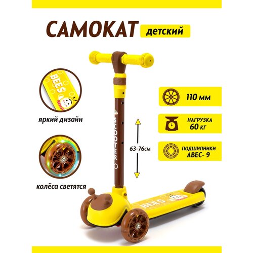 Трхколсный самокат отличный подарок ребенку, который только начинает учиться катанию.Самокат с интересным дизайном под животноеолень, динозавр, пчела)Расположение двух колс спереди является самой безопасной версией самоката и прекрасно подойдт самым маленьким, позволит вашему малышу уверенно чувствовать себя в движении и не допустит падений.Дисковые PUполиуретановые) колеса диаметром: передние 11 мм, широкое заднее колесо 70 мм, шириной 40 мм, малошумные, с высококлассными подшипниками ABEC9, обеспечивают быстрый разгон и прекрасный накат.При движении колеса светятся, не требуют батареек, за счет встроенных светодиодов, 3 вида свечения диодов.Платформа оснащена противоскользящим покрытием, длина деки 27 см, ширина 11 см.Регулируемая высота рулевой стойки от 63 до 76 см, 3 положения регулировки. Материал руля: сталь, материал стойки руля: сталь.Рельефные прорезиненные грипсы со стопорами для рук, исключат соскальзывание.Съмная ручка делает данный самокат более удобным и компактным, обеспечит максимальную мобильность и удобство хранения и перевозки.Удобный рулевой хомут клипса, для фиксации рулевой стойки сведет к минимуму люфт руля.Торможение с помощью широкого ножного тормоза на заднем колесе обеспечит безопасную остановку. Максимальная нагрузка до 60 кг.