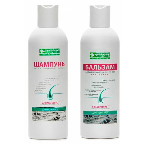 В состав комплекта входит: 1) Натуральный шампунь на основе грязи Сакского озера для роста волос использует целительное действие грязей. Отжим лечебной грязи Сакского озера аквабиолис) хорошо усиливает кровообращение вокруг луковиц, тем самым укрепляя и стимулируя активный рост волос, останавливая их выпадение и насыщая корни витаминами, что увеличивает густоту. Помогает восстанавливать поврежденные волосы, защищать их от разрушения и вредного воздействия, предотвращает выпадение волос. Стимуляция роста обеспечивается благодаря активизации кровообращения в клетках кожи головы. Волосы становятся более густыми и сильными. Растительные компоненты поддерживают и сохраняют силу и блеск волос. 2) Лечебный бальзам на основе грязи Сакского озера 34;для роста волос34; укрепляет волосы, активирует их рост.Благодаря аквабиолису усиливается приток крови, что способствует оживлению 34;спящих34; волосяных луковиц. Бальзам ускоряет рост волос, утолщает и восстанавливает волосы.Активные компоненты увлажняют, защищают волосы от вредного воздействия окружающей среды.
