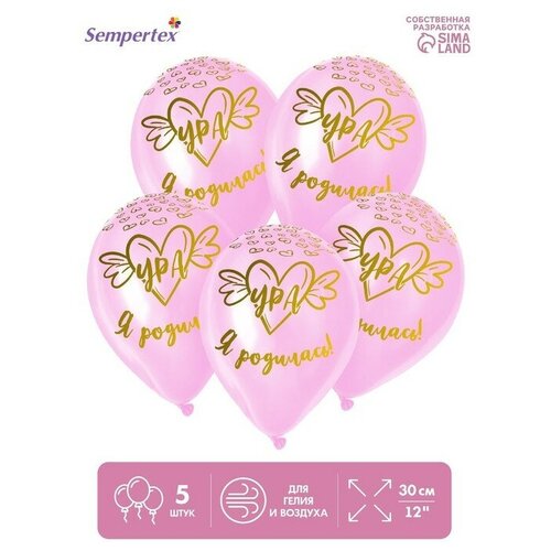 Шар латексный 12 Ура, я родилась, пастель, набор 5 шт, цвет розовый