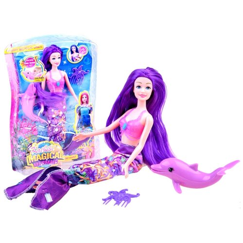 Кукла русалка BLD184 Kaibibi с дельфином. Кукла-русалка с длинными волосами позволит окунуться в удивительный морской мир, обитательницей которого она является. Девочкам понравится возможность мыть волосы, сушить их феном и делать оригинальные прически. Хвост русалки можно превратить в платье. В наборе: фигурка дельфина, тапочки, расческа. С куклой-русалочкой можно играть во множество сюжетно-ролевых игр. Высота куклы 30 см. Материал: резина/пластик.