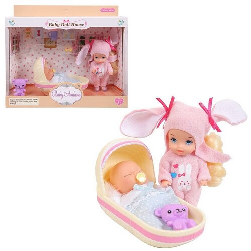 Этот очаровательный игровой набор не оставит равнодушной ни одну девочку. В его составе старшая сестричка, новорожденный малыш в кроватке-люльке и их любимый маленький медвежонок. Куколка одета в розовый комбинезон и шапку-накидку, оформленную в виде длинноухого зайчика. Малыш с соской спит в кроватке, он накрыт мягким голубым одеяльцем. Дополняют набор бутылочка, бутылочка-поильник, 3 игрушки для малышей и сумочка.