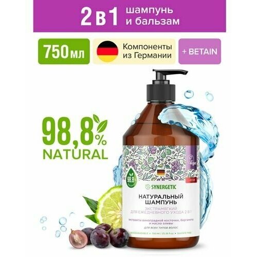 Бессульфатный шампунь Synergetic 34;Экстрамягкий для ежедневного ухода 2 в 134; эффективное средство для очищения кожи головы и всех типов волос более чем на 98 состоит из натуральных компонентов.Шампунь деликатно очищает, эффективно ухаживает за волосами и защищает кожу головы. Формула с бетаином восстанавливает поврежденные волосы, укрепляет и стимулирует их рост. Благодаря формуле 2 в 1 бальзам в составе шампуня облегчает расчесывание, придает волосам эластичность, смягчает и увлажняет их.Натуральный шампунь содержит комплекс масел миндаля и оливы, который восстанавливает волосы, придает им мягкость и эластичность. Активные компоненты в составе шампуня укрепляют волосы и стимулируют восстановление кератиновых волокон. Экстракты виноградной косточки, бергамота и мелиссы нормализуют баланс кожи головы.Мультифункциональный компонент натурального происхождения софоролипид мягко очищает кожу головы и сохраняет естественный микробиом, а инновационный увлажняющий комплекс усиливает барьерные свойства кожи и обеспечивает до 72 часов глубокого увлажнения.Физиологичный уровень pH 5,5 устраняет сухость кожи головы и гарантирует безопасность при частом использовании средства даже для чувствительной кожи.Натуральный шампунь не содержит SLS, SLES, парабенов, силиконов, минеральных масел и красителей, а также компонентов животного происхождения, не тестируется на животных и сертифицирован британской организацией The Vegan Society. Знак Vegan мировой стандарт этичной продукции.