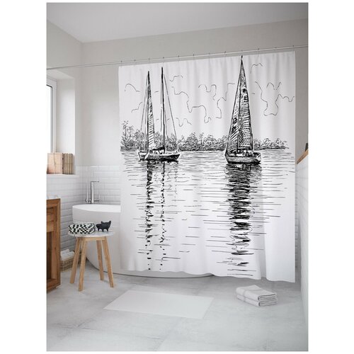 Штора для ванной, занавеска в ванную комнату JoyArty Графические парусники из сатена, 180х200 см с крючками