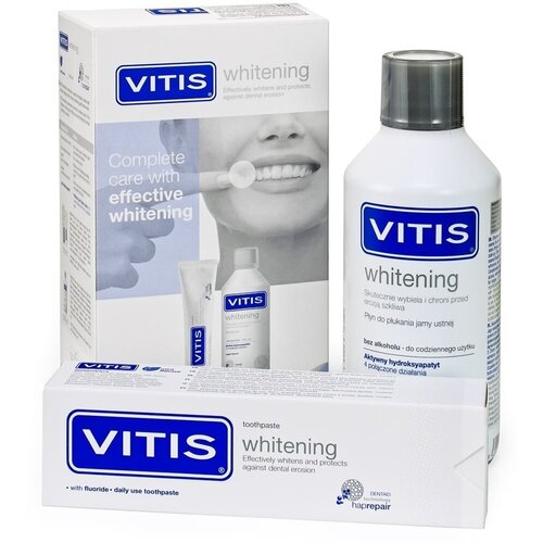 Артикул 854333 Активные вещества: Частицы гидроксиапатита: запечатывают открытые дентинные канальцы, что предотвращает действие раздражающих факторов на оголенный дентин. Заполняют микротрещины эмали, тем самым зрительно осветляют цвет зубов; Тройная система фосфатов: размягчение твердого и мягкого зубного налета, предотвращение его появления; Ксилит: сохраняет свежесть дыхания и препятствует развитию кариеса; Поливинилпирролидон PVP): предотвращает окрашивание зуба; Монофторфосфат натрия: предотвращает появление кариеса и укрепляет эмалью; Состав: зубная паста: вода, глицерин, сорбитол, диоксид кремния, поливинилпирролидон PVP), лаурил сульфат натрия, диоксид титана, монофторфосфат натрия, трифосфат пентанатрия, перлит, гексаметафосфат натрия, ксантановая камедь, ксилит, пирофосфат тетракалия, частицы гидроксиапатита, ментон глицерин ацеталь, сахарин натрия, хлорид калия, метилпарабен натрия, ацесульфам калия, ароматизатор.Ополаскиватель: вода, глицерин, пропиленгликоль, ксилит, поливинилпирролидон, гидрогенизированное касторовое масло PEG40, трифосфат пентанатрия, гексаметафосфат натрия, пирофосфат тетракалия, лимонная кислота, бензоат натрия, монофторфосфат натрия, карбомер, ацесульфам калия, лаурил сульфат натрия, метилпарабен натрия, ментон глицерин ацеталь, гидроксиапатит, сахарин натрия, ароматизатор, C. I. 42051 Показания: Ежедневная чистка зубов с достижением отбеливающего эффекта; Гигиена полости рта в целом; Профилактика возникновения кариеса. Состав набора: Зубная паста VITIS Whitening, 100мл Ополаскиватель полости рта VITIS Whitening, 500млВкус: мята Противопоказания: Не применять при аллергии на любой из компонентов. Не рекомендуется для применения детям младше 6 лет. Хранить вдали от солнечных лучей и в недоступном для детей месте. После вскрытия упаковки использовать ополаскиватель в течение 12 месяцев.Упаковка: фирменная картонная коробка