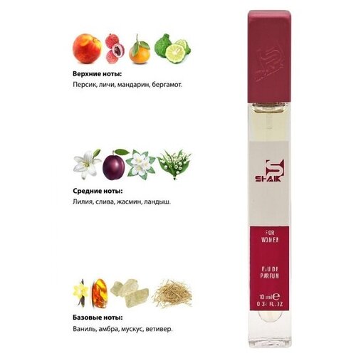 Верхние ноты: личи, мандарин, персик. Ноты сердца: белая лилия, жасмин, ландыш. Базовые ноты: ваниль, слива, амбра. В сердце этого аромата невероятно нежные ноты благоухающего ландыша, цветущего жасмина и волшебной белой лилии. Сладость сочных фруктов гармонирует с цветочными ароматами, в результате чего получается свежий, неповторимый, незабываемый парфюм. Он оставляет после себя шлейф и приятное впечатление. Присутствующие ноты ванили, сливы и амбры дополняют чудесную композицию аромата, завершая образ красивой и обаятельной хозяйки парфюма