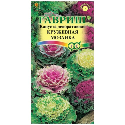 Гавриш, Капуста декоративная Кружевная мозаика, по 0,05 г, Декоративная смесь растений, высотой до 60 см. Листья курчавые с сильногофрированными краями имеют зеленую, белую, кремовую или пурпурнофиолетовую окраску, наиболее декоративны в конце летаначале осени. Растения светолюбивы, предпочитают богатые гумусом почвы; холодостойки. Размножают семенами. Посев на рассаду в конце марта. При температуре почвы 1820 С всходы появляются через 35 дней. Землю поливают до и сразу после посева, молодые всходы лишь немного опрыскивают и начинают поливать, когда они окрепнут. Выращивают рассаду при температуре 1216 С. В грунт высаживают в конце апреляначале мая. Капуста отзывчива на полив, рыхление и подкормку минеральными удобрениями. Идеальная для одиночных и групповых посадок, используется как обсадочное растение. Пересаженная осенью в контейнер, сохраняет декоративность до Нового года. Вид: Brassica oleracea f. viridis L.) DC.