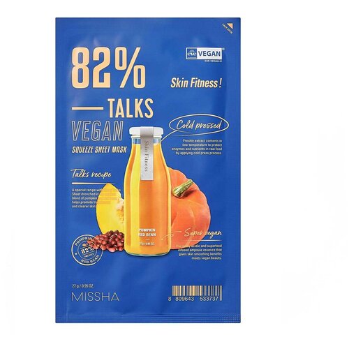 Маска тканевая MISSHA Talks Vegan освежающая для гладкости кожи с экстрактами тыквы и красных бобов, 27 г