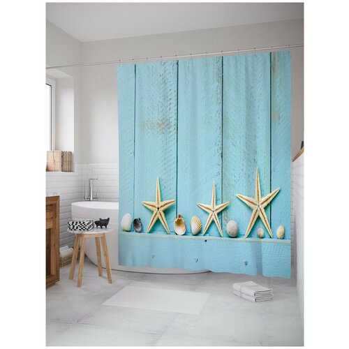 Штора водоотталкивающая для ванной, занавеска в ванную комнату тканевая JoyArty Ракушки на доске, 180х200 см