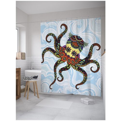 Штора занавеска) для ванной JoyArty Духовный осьминог из сатена, 180х200 см с крючками