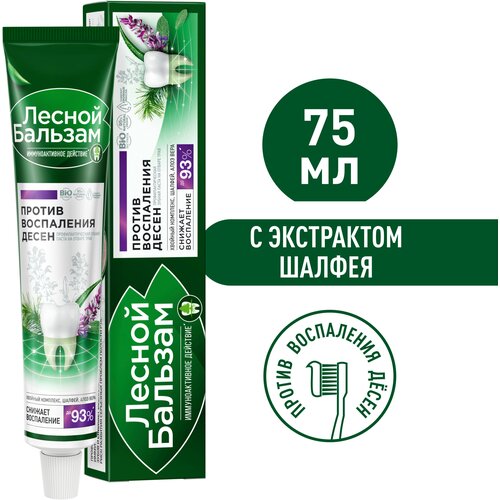 Профилактическая зубная паста Лесной бальзам на отваре трав c иммуноактивным действием помогает решить проблему воспаления десен и в 2 раза улучшает работу собственного иммунитета полости рта, снижая риск развития проблем с деснами.Клиническидоказанный эффект: С первого применения исчезает болезненность десен До 94 снижает воспаление десен при регулярном использовании В 5 раз снижает скорость образования налета на зубах, уменьшая бактериальную нагрузку на мягкие ткани полости ртаОсобенности состава:Насыщенный хвойный вкус. Содержит хвойный комплекс на основе экстрактов пихты, живицы, можжевельника) с отваром 5 целебных трав, экстрактом шалфея и соком алоэ. Богатый натуральный состав способствует снижению воспаления и отечности десен, блокирует развитие воспалительного процесса и стимулирует восстановление мягких тканей полости рта.Зубная паста изготовлена на отваре 5 трав ромашка, тысячелистник, крапива, зверобой, чистотел). Отвар трав используется взамен обычной воды и получается в результате низкотемпературной экстракции 35), что позволяет достичь максимально полного переноса ценных веществ из растений в отвар.Зубная паста бережно очищает эмаль за счет природного абразива диоксида кремния Silica). Диоксид кремния не царапает эмаль в процессе чистки зубов, при этом позволяет добиться равномерного удаления налета по всей поверхности зубов.Зубная паста содержит фтор на уровне 1000 ppm, что соответствует среднему уровню содержания фторидов и подходит для ежедневной защиты эмали от деминерализации.Рекомендации:Зубная паста от воспаления десен одобрена Стоматологической Ассоциацией России и рекомендована в качестве профилактического средства при появлении проблем с деснами гингивит, пародонтит). Использовать 2 раза в день до улучшения состояния десен, после минимум 1 раз в день, вечером, для укрепления десен.Свойства подтверждены клиническими испытаниями РФ, 20162017.При совместном использовании зубной пасты и ополаскивателя Лесной бальзам на основе хвойного комплекса с отваром трав согласно клиническим испытаниям, через 1 месяц использования, РФ 2017Не является лекарственным средством. Применение не освобождает от посещения стоматолога.